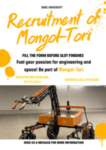 Mongol-Tori is a next generation mars rover. It is a project by BRAC University which is designed for participation in the University Rover Challenge (URC), an international robotics competition. The rover is built to assist human explorers on Mars by performing tasks like object retrieval, autonomous traversal, equipment servicing, planetary analysis, and life detection